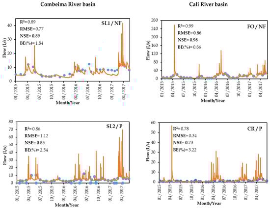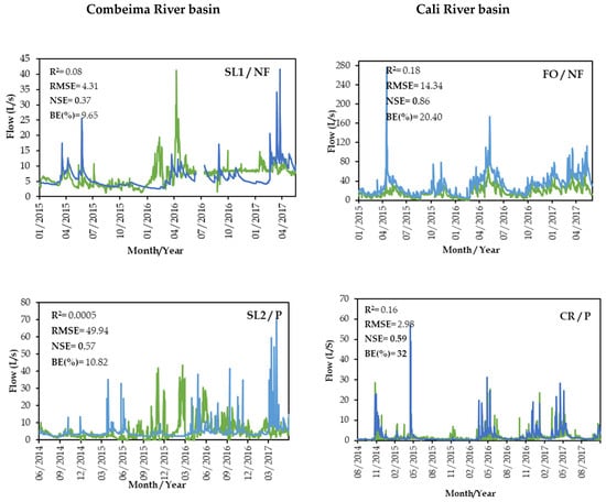 The hydrographs observed and simulated for the TETIS model in the study watersheds, along with their respective LULC, are presented. This study includes Santa Lucía 1/natural forest (SL1/NF), Santa Lucía 2/Pastures (SL2/P), and Mojarra/agroforestry system with coffee (MOJ/AS-c) in the Combeima River basin; Faro/natural forest (FO/NF), Cristo Rey/Pastos (CR/P), and Farito/agroforestry system with coffee (FTO/AS-c) in the Cali River basin. The data covers the period from April 2015 to November 2017. R2 = coefficient of linear determination, RMSE = root mean square error, NSE = Nash–Sutcliffe efficiency, BE = percent error in balance.