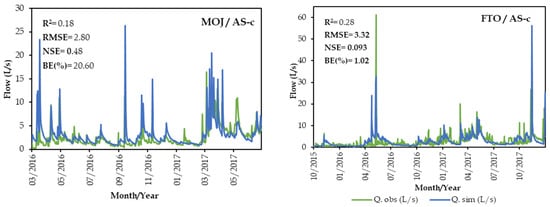 In the Cali River basin, the natural forest micro-basin FO/NF showed the highest NSE value, at 0.86. FTO/AS-c had the lowest BE, at 1.02%. Additionally, this micro-basin and land use class had the best relative value of R2. When comparing the observed and estimated flows in the six micro-watersheds and three investigated LULC classes, it is evident that MOJ/AS-c, despite having a BE of 20.60%, showed a moderate degree of NSE, at 0.48; an R2 value of 0.18, which is not the lowest; and the best RMSE value of 2.80.