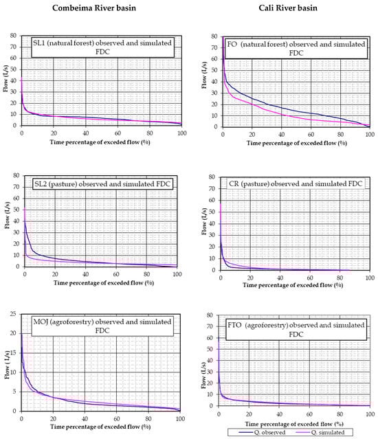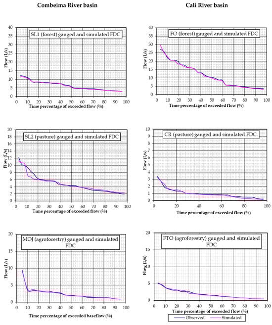Figure 7 shows the degree of similarity between observed and simulated daily mean flows for the Combeima and Cali River micro-basins. The highest degree of similarity was observed in MOJ, followed by SL2 and SL1 in Combeima and by FTO, CR, and FO in Cali. Overall, the lowest degree of similarity was found in FO, followed by SL1. It is important to note that this analysis was essentially based on the careful observation of the behavior and trends of the respective CDFs and flow values in the respective quartiles. Thus, the daily flow regime in CR and FTO showed the least variation, with fluctuations between the first and third quartile values of 0.88 L/s and 1.81 L/s, respectively. In contrast, SL1 showed a much larger variation (6.09 L/s), between these two quartiles. This research confirms that there is an important relationship between a low variability in the flow duration curve (FDC) and the presence of subsurface storage processes that affect the flow, indicating that the flow tends to remain stable over time []. The daily flow regime and behavior at FO showed the greatest variation, which can be interpreted as being partly associated with steep slopes in this micro-basin.