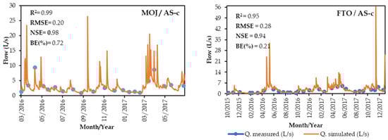 Initial storage conditions for the model’s four tanks were defined based on soil hydro-physical characteristics. Model parameters were iteratively adjusted to achieve physical consistency and the best fit between observed and simulated flows. Agreement was sought between the model-produced water volumes and those observed in each micro-basin. Gauging datasets from each EM were used to recalibrate the model, enhancing the accuracy of the predicted Q values (Table 3).