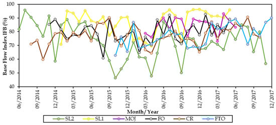 The Cali River basin reported the highest IFBs, ranging from 89 to 92.6%, in FO/NF in December 2014, July 2016, and January 2017. In CR/P, the highest percentage values of IFB were also around 90%; in both FTO/AS-c and CR/P, the predominating values were between 70 and 80% for most months of the year. The lowest absolute values occurred in October 2014 and October 2015 and were 59.6% in CR and 60.7% in FO, respectively. According to Aboelnour et al. [], the decrease in base flow observed in their micro-watershed study conducted at Walzem Creek may be attributed to the reduction in vegetation cover, particularly forest cover, and the increase in soil impermeability caused by soil compaction. This allows water to flow more quickly, resulting in greater surface runoff and a subsequent decrease in base flow in the main drainage network.