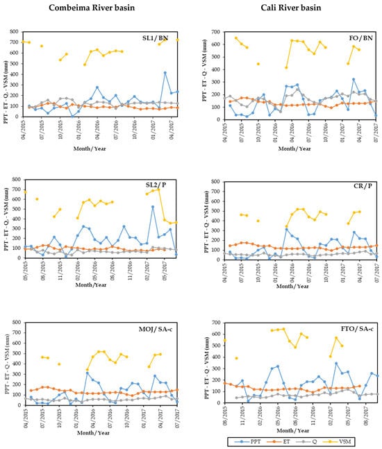 ET is a crucial component of water balance and represents the outflow (output) of water from a river basin’s natural hydrological system. In the WB equation, its quantification has typically been achieved through empirical methods and formulas [,,,,]. This study estimated ET as either ETP or ETR (Potential or Real ET) using the methods of Garcia Lopez [,] based on climatological information from the Chapetón station for SL1, SL2, and MOJ in Combeima and from Margarita and Cañaveralejo for FO, FTO, and CR in Cali. ET was approximately 1038.61 mm yr-1 for the Combeima micro-basins and 1175 mm yr1 for the Cali micro-basins. These results were adjusted according to the predominant LULC, as reported by Ramírez-Builes et al. [], Jaramillo-Robledo et al. [], and Vásquez-Velásquez et al. []. Thus, water balance was estimated based on monthly records of precipitation (PPT), calculated evapotranspiration (ET), recorded streamflow (Q), and recorded volumetric soil moisture; the results are described below.