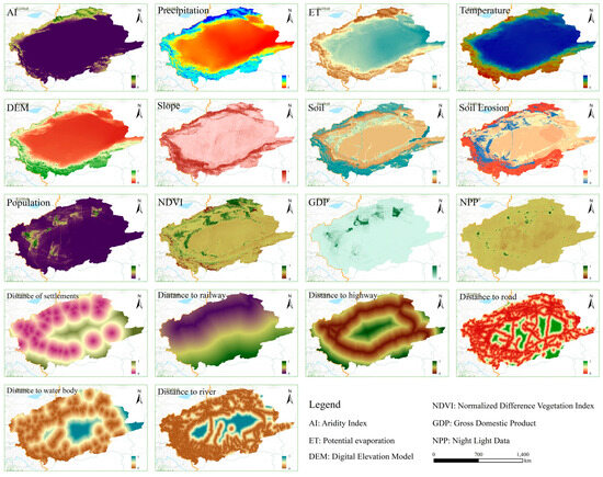The data types used in this study primarily included spatial data and statistical data. The spatial data were mainly land-use and land-use simulation influencing factor data. The land-use dataset consisted of six series of products: China’s 30 m annual land-cover product (30 m), the Chinese Academy of Sciences (30 m) product, GlobeLand 30 (30 m), ESA_CCI (300 m), MODIS (500 m), and the Chinese Academy of Sciences (1000 m) product. The nine sets of LULC data were reclassified according to the first-level land-use classification standard of the Chinese Academy of Sciences, which includes the six categories of cropland, forest land, grassland, water, construction land, and bare land. As shown in Figure 2, the PLUS model influencing factor data included a total of 18 categories, such as temperature and precipitation. The statistical data included (1) economic and climatic data required for the SD model, sourced from the Xinjiang Uygur Autonomous Region Statistical Yearbook from 2000 to 2020, and (2) economic data for the CMIP6 project, derived from GDP forecast data under five SSPs [27]. The population data parameters were based on grid data at the scale of future Chinese population censuses [28], and the temperature and precipitation data were sourced from the A Big Earth Data Platform for Three Poles website. Details of the data are provided in Table 1.