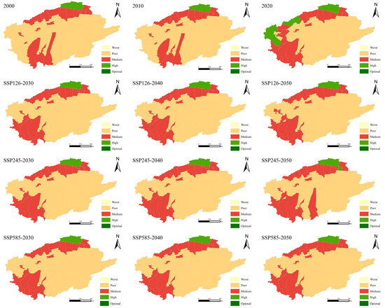 Using a 5 km × 5 km fishnet to explore the distribution characteristics of HQ in the Tarim River Basin, as shown in Figure 9, the central cities and surrounding areas of the five prefectures (Hotan, Korla, Aksu, Kashgar, and Atush) generally fall into the medium category. Optimal areas occur mainly on the southern slopes of the Tianshan Mountains, in the Kunlun Mountains, in the Altun Mountains, and some desert riparian zones. Unlike the county scale, the fishnet scale, with its smaller grid size, reveals more areas with the worst HQ. Compared to 2000, areas of high and optimal HQ show an expanding trend in 2020 and the three simulated scenarios. This phenomenon mainly occurs in the southwestern region of the Tarim River Basin, along both sides of the desert highway, and in the lower reaches of the Tarim River. Additionally, the Keriya River Basin shows improvement in HQ.