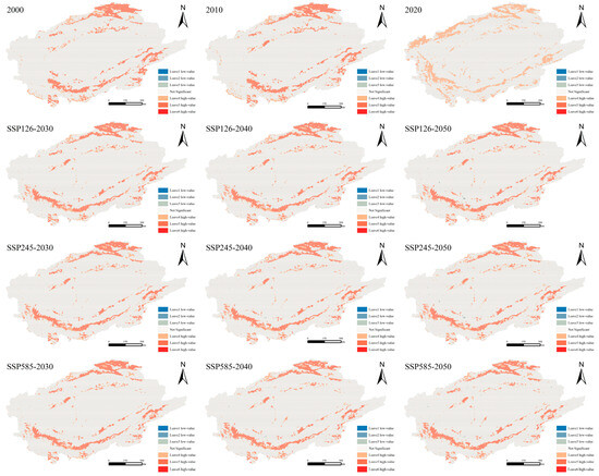 As shown in Figure 12, during the historical period of 2000–2020 and under the three simulated scenarios for 2030–2050, the Moran’s I index remained positive, generally ranging between 0.800 and 0.830. This reflects a high degree of spatial clustering of HQ in the Tarim River Basin. The clustering predominantly manifests as high–high and low–low types, with the spatial distribution exhibiting typical arid region heterogeneity. The vast desert areas mainly exhibit low–low clustering. The transitional zone between the Taklamakan Desert and populated areas includes China’s longest inland river, the Tarim River, with typical desert riparian forests along its banks, characterized by a high–high clustering of HQ. No significant clustering occurs in the central urban areas and densely populated regions. The areas surrounding urban centers, primarily agricultural areas, predominantly show a low–low HQ. In contrast, the outer highland and mountainous regions exhibit high–high clustering, with the southern slopes of the Tianshan Mountains and the Kunlun Mountains showing significantly higher clustering than other areas. Overall, the pattern is characterized by a high–high clustering on the periphery and a low–low clustering in the center.