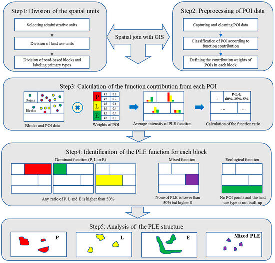 Land use/cover change data, particularly those classified from satellite remote sensing images, have long been regarded as important materials for recognizing the landscape structure of earth surfaces in large areas. The main limitation of this method is that only comprehensive land use/cover types, namely, construction land, water area, and forest land, can be identified and separated. Thus, this method cannot identify the refined structure of PLE functions regarding human–land relationships for spatial planning and regulation.
