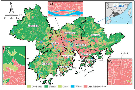 The GBA was first divided into different blocks using a combination of land cover data, road networks, and administrative boundaries. The GlobalLand30 V2020 product, provided by the Ministry of Natural Resources of China (http://www.globallandcover.com/) (accessed on 10 August 2023), was used to extract information on land cover/use. Cultivated land, forest land, grasslands, water bodies, and artificial surfaces were classified for the GBA (Figure 2), with an overall accuracy of approximately 85.72% [44]. The road network for 2020 was derived from OpenStreetMap data (https://www.openstreetmap.org/) (accessed on 1 December 2021), which is an important open source for collecting traffic data. We first converted GlobalLand30 into vector format to obtain land cover/use patches, and then the land cover/use patches were overlaid with the road network and administrative boundaries to divide the blocks. During this process, rivers were not separated by the traffic network to maintain their integrity (Figure 2a). Other natural elements, such as forests, farms, and grasslands, were kept as large patches and only separated into different parts when traffic roads passed through them (Figure 2b). As the superposition will produce many fine raw polygons, we eliminated polygons with an area less than 9 × 104 m2, as the Code of Urban Residential Areas Planning & Design (GB 50180-2018) [45] provides a criterion that small residential areas are generally between 2 × 104 m2 and 9 × 104 m2. Finally, the entire GBA was divided into 49,618 blocks. Then, according to the PLE space classification system proposed by Fu et al. [46], we reclassified different land use types and labeled the primary type of PLE function for each block.