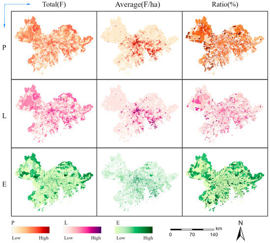 where is the ratio of P, L, and E in spatial block ; is the area (ha) of block ; and represents the total function intensity of P, L, and E in block .
