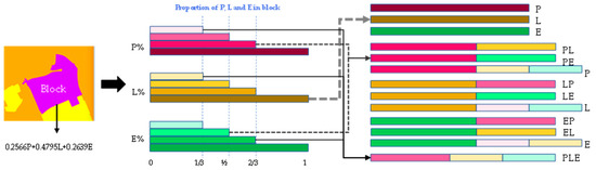 where is the function intensity of P, L, and E in spatial block ; is the POI point that located in block ; and is the weight of each POI type. As the area of each block is inconsistent, using the total function intensity may hinder comparisons between different blocks. Thus, the value of the total function intensity in a block is further transformed into the average ground intensity, and the function proportions of P, L, and E in each block are calculated accordingly to determine the type of PLE function, which can be expressed as Formula (2).