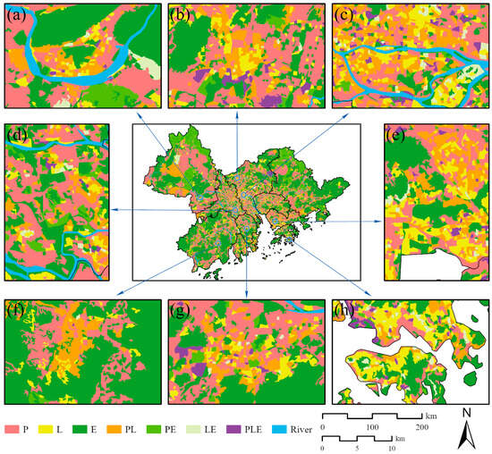 Based on the above principle, the identified pattern of PLE blocks in the GBA is shown in Figure 5. In general, ecological spaces occupy the largest proportion of the total area in the GBA, while living–ecological (LE) spaces account for the smallest. The spatial distribution of ecological spaces covers almost the entire GBA region. However, the size of ecological spaces in the central area of the GBA is significantly smaller than that in the peripheral zones. This reflects a weaker ecological function in the central part of the GBA, possibly due to landscape fragmentation resulting from intensive human activities [48]. Living spaces are mainly concentrated in the central and eastern parts of the GBA, with particularly dense distribution in the coastal zones, but generally scattered and small in size. In contrast, production spaces are more prominent in the northern and western regions of the GBA, characterized by strong connectivity and extensive coverage. In terms of the composite spaces, production–living (PL) and production–ecological (PE) areas encompass a larger area than that of LE. The production–living–ecological spaces are commonly observed in economically developed coastal cities such as Guangzhou, Shenzhen, and Hong Kong (Figure 5b,c,e,g,h).