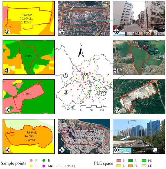 To better illustrate the advantages of our proposed PLE function type identification method over traditional classification results that solely rely on land use/cover data, urban blocks with different proportions of PLE functions were randomly sampled and compared with the ESA global land cover product at 10 m resolution (https://worldcover2020.esa.int/) (accessed on 15 October 2023). The interpretation accuracy of the PLE blocks was further validated using high-resolution imagery from Google Earth (Figure 10).