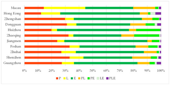 The proportion of each dominant function type in each city was calculated and the results are shown in Figure 7. According to the national garden city standards proposed by China’s government, all types of green areas and waters within a built-up area should account for at least 43% of the total built-up area [17]. Therefore, achieving a balance between the development of living and production spaces and ecological conservation is crucial. A disordered spatial pattern of PLEs within the same region can exert pressure on limited land resources, resulting in the inefficient use of spatial resources and undermining the coordinated and sustainable development of urban structures [49]. An excessively high proportion of a production-related function types can encroach upon living spaces in urban agglomerations. Conversely, a more balanced structure of PLE functions can satisfy residents’ daily needs more easily [17]. Great differences are observed in the dominant function types among cities, and most of the cities in the GBA are dominated by ecological function based on the area proportion of function intensity in PLE blocks. Over 40% of the total area in Macao and Shenzhen is dominated by production and living functions; more than 50% of the total area in Jiangmen, Huizhou, and Hong Kong is dominated by ecological functions; while approximately 50% of the total area of Zhongshan, Zhuhai, and Guangzhou is dominated by ecological functions. Regarding the type of mixed functions, Zhaoqing and Huizhou have a relatively higher ratio of dominant functions that include production and ecological services; Shenzhen, Macau, and Dongguan have a relatively high ratio of dominant functions that include production and living services; and Guangzhou, Dongguan, and Hong Kong have a higher relative ratio of dominant functions than other cities that include production, living, and ecological services. The ratio of mixed functions is closely related to the development of land resources and the level of social and economic development. Shenzhen, Dongguan, Foshan, and Zhaoqing, which are important production bases in the GBA and have many manufacturing businesses, high-tech enterprises, and forest plantations, have the highest proportion of production functions among the 11 cities. Among the core cities in the GBA (excluding edge cities such as Zhaoqing, Jiangmen, and Huizhou), Hong Kong has the best coordinated development of PLE functions, which can be explained by the following two aspects. First, Hong Kong has controlled the proportion of human activity space to within 50% of the total area; and second, the proportions of mixed, production, and living functions are relatively similar. Taking Jiangmen as an example, the proportion of production spaces significantly exceeds that of living spaces, while mixed spaces are insufficient, indicating a need to optimize the land spatial pattern. This illustrates how the composition of different PLE function types within a city can help understand and resolve conflicts between human activities and territorial spatial layout, and mixed spaces can ensure a sustainable and healthy living environment for residents. Moreover, our research reveals that mixed spaces are relatively rare in the GBA cities, and peripheral areas are predominantly composed of single or dual function types (Figure 5), highlighting the necessity for optimization in these regions. Generally, as population and GDP grow, the overall ecological function of urban agglomerations tends to decline [21]. For sustainable development in the GBA, it is crucial to enrich the land use multifunctionality, promote urban layouts based on PLE functional distribution heterogeneity, and further facilitate the high-quality development of territorial spatial patterns.