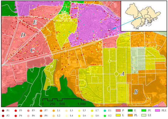 Taking Zhongcun Street, Panyu District, Guangzhou City as an example, several typical large communities are observed, as shown in Figure 9. Area A is Clifford Estates, a famous and typical large residential community in the GBA, with a total area of 500 ha and a permanent resident population of exceeding 300,000. This area was correctly identified as a living function unit based on the collected POIs. However, block B, which is subdivided from region A, was misjudged as a small production and living function unit. The main reason was that this block was classified as artificial land based on the 30 m resolution land cover/use data, and all the collected POIs in this block are parking lots (i.e., P7 type), an issue that persists even when using a combination of POIs and land cover/use data for identification. In fact, high-resolution remote sensing images indicate that it is a pond, and it would be more reasonable to label this block as an ecological unit, considering its physical attributes and dominant functions. Refined land cover/use data are needed to improve the identification accuracy. Areas C and E are also large residential communities with thousands of houses. As the surrounding street includes a few small companies, such as decoration design, garages, retail stores, and others, the number of POIs in non-residential areas is significantly higher. Consequently, these two blocks were misinterpreted as production units, which resulted in a miscalculation. Regarding block D, although it is similar to block C and was classified as artificial land in 30 m resolution land cover products derived from remote sensing images, it is mainly composed of building material companies. Because a few POIs only capture such information, it was correctly recognized as a production block.