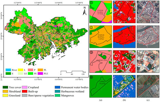 Comparison between PLE identification result and classification product. (a) Examples of PLE identification results in this study. (b) ESA land cover product at 10 m resolution. (c) Google Earth images. ①–④ are the examples for the comparison.
