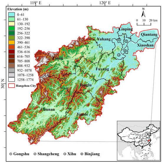 Hangzhou City was chosen as the research area for ecological monitoring and evaluation. Hangzhou serves as the capital of Zhejiang Province in southeastern China (refer to Figure 1). The urban area spans from approximately 29°11′ to 30°34′ N in latitude and 118°20′ to 120°44′ E in longitude. As of 2022, the city’s population was 12.4 million. Renowned for its West Lake, Hangzhou’s traditional urban core lies along the northeastern bank of this iconic water body. Over the past two decades, the Qianjiang CBD (also known as Qianjiang New Town) has undergone significant development east of the central city. The research area administers 10 districts, 2 counties, and 1 county-level city, which mainly include Shangcheng District, Gongshu District, Xihu District, Binjiang District, Xiaoshan District, Yuhang District, Linping District, Qiantang District, Fuyang District, Lin’an District, Tonglu County, Chun’an County, and Jiande City. Within the urban land area, mountains and hills, plains, and various water bodies occupy 65.6%, 26.4%, and 8% of the total area, respectively. Situated south of the Qiantang River, the study area is characterized by highly developed regions, cultivated land, and small-scale forested areas. Over the past decade, extensive land-use transformations have occurred, converting farmlands and wetlands into highly developed areas. Furthermore, the region has experienced rapid urbanization, leading to ecological challenges and a decline in ecological quality.