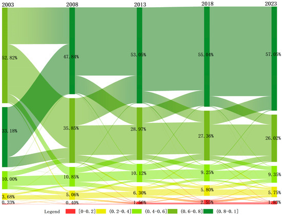Figure 4 illustrates the proportion of IRSEI grades and their conversions from 2003 to 2023. The grade transformation reveals that IRSEI values remained stable during this period, consistent with previous studies’ conclusions. The areal proportion of grades 0–0.2 was the lowest, fluctuating between 0.33% and 2.55%; that of grades 0.2–0.4 was the second-lowest, fluctuating between 3.68% and 6.30%; the largest proportion belonged to grades 0.8–1.0, fluctuating between 33.18% and 57.05%. The proportions of grades 0.4–0.6 and 0.6–0.8 varied considerably, fluctuating from 9.25% to 52.82%. Between 2003 and 2008, there was a significant improvement in ecological quality, with approximately half of the area in grades 0.6–0.8 transitioning to grades 0.8–1. From 2008 to 2013, ecological quality continued to improve, with the area of grade 0.8–1.0 increasing from 47.84% to 53.05%. However, urban expansion led to significant land consumption, including farmland, forests, and even ecological protection areas for urban construction. This expansion resulted in severe air and water pollution, with emissions from traffic, industry, and residents negatively impacting the ecological environment. Consequently, the proportion of grade 0–0.2 increased from 0.40% to 1.56%. Ecological quality showed slight improvement from 2013 to 2018, remaining stable from 2018 to 2023.