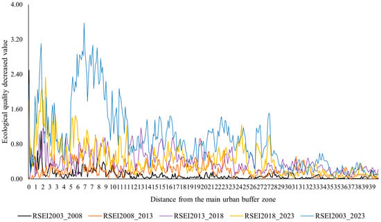 For further analysis and understanding of the microscopic characteristics of ecological quality change in Hangzhou, a concentric ring with a radius of 1 km was established in the central urban area of Hangzhou to analyze the spatial horizontal distribution characteristics of areas with significant variations in Hangzhou (Figure 5). The area of these rings is the same, in order to truly reflect the true density of the change in ecological quality from different urban centers. From 2003 to 2008 and from 2008 to 2013, significant variations near the central urban area changed slightly in terms of their horizontal extent; however, after 2008 to 2013, these differences expanded, consistent with the areas of IRSEI variation. Between 2003 and 2023, areas experiencing significant changes in ecological quality conflicted in Hangzhou, distributed within ranges of 1–3 and 5–10 km. This trend suggests that the changes in IRSEI from 2003 to 2023 were closely related to urban expansion, population change, and economic development. Additionally, influenced by the construction of ecological civilization and adjustments in the development structure, the IRSEI remained generally stable up to 30 km outside the city center, indicating a trend of agglomeration in the center and significant areas in the surroundings. Overall, the area within the scope of the ecological quality changes increased as the increase in distance to the center of Nanjing City slowed, and near Nanjing City, land use change is more intense and the ecological quality of change is more obvious, illustrating that the change of land use will have great influence on ecological quality, which is consistent with other studies [2,15,21,26].