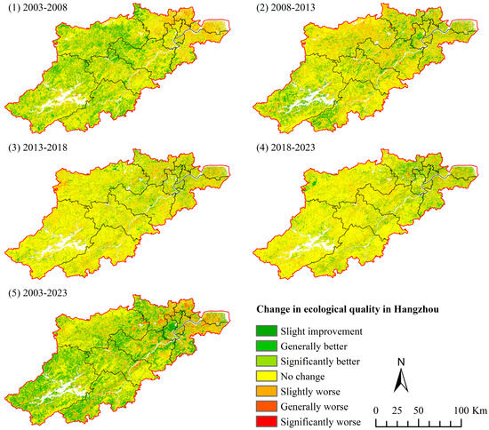 Table 5 displays the shifts in the ecological quality of Hangzhou City from 2003 to 2023. Over the past two decades, changes in ecological quality have primarily fallen into three categories—slight improvement, no change, and slight deterioration—accounting for 85% of the total change. The proportion of slight improvement surpassed or closely approached 24% from 2003 to 2008, significantly outweighing the proportions of slight, moderate, and significant deteriorations. Between 2008 and 2013, the proportion of slight variations exceeded 16%, with evident improvement accounting for nearly 19.15%. From 2013 to 2018, the proportions of slight improvement and deterioration remained relatively stable. Furthermore, the proportion of evident improvement was 8.3% from 2000 to 2005, markedly higher than that of evident worsening (1.64%). Between 2018 and 2023, as well as from 2003 to 2023, the proportion of slight improvement (13.69% and 31.42%, respectively) notably exceeded that of less slight improvement (8.77% and 10.85%, respectively). This pattern underscores the continuous and steady enhancement of Hangzhou’s regional ecological quality from 2018 to 2023.