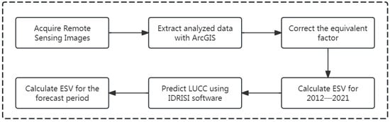 Based on this, this study takes the Wuhan urban area as the research object, and explores the impacts of LUCC on the ESV of the Wuhan urban area in the decade from 2012 to 2021. Then, the ESVs of the Wuhan urban agglomeration are predicted for 2035 and 2050, and the future ESVs are quantified on the basis of data extraction and analysis. The future changes in LUCC and ESV in the Wuhan Urban Agglomeration are thus derived with a view to providing a reference for the sustainable development of the region. A flow chart of the main steps of the study is shown in Figure 1.