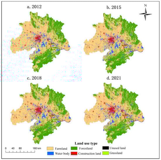 The boundary data for the study area were derived from the vector data for counties and districts nationwide and the vector data for the planning boundary of the Wuhan city circle. Firstly, all the data were uniformly projected onto the WGS-84 coordinate system to ensure the consistency and accuracy of the data. Subsequently, a radiometric calibration and atmospheric correction were performed sequentially for the remote sensing data at each stage to eliminate the influence of environmental factors on data quality. On this basis, according to the standard of the Classification of Land Use Status Quo [57], combined with advanced methods such as visual interpretation and the maximum likelihood method, we meticulously classified the land use types into six categories according to the different uses of the land: arable land, forest land, grassland, watersheds, unutilized land, and construction land. Finally, in order to ensure the accuracy of the interpretation results, we further used the high-resolution images of Google Earth to verify and calibrate the interpretation results, and the Kappa coefficients of the remote sensing images of the four periods under study were 0.78, 0.81, 0.88, and 0.81, respectively. Data processing involving equivalent factor modification was completed through Excel (2019) spreadsheet processing. The spatial distribution of land use types in the study area from 2012 to 2021 is shown in Figure 3.