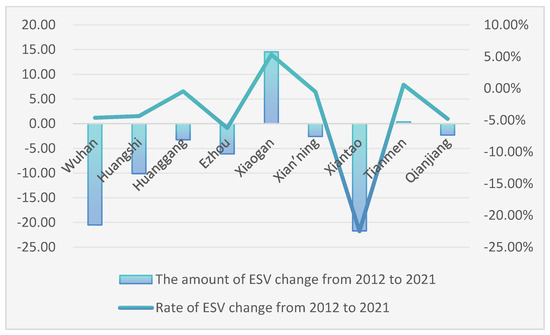 Amount and change rate of change in the ESVs of cities in Wuhan Urban Agglomerations from 2012 to 2021.
