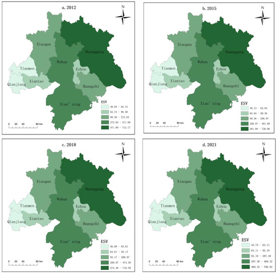In order to clearly reveal the spatial evolution of ESV in different years, this study, based on the ArcGIS 10.7 platform and using the natural discontinuity hierarchy method, conducted an in-depth analysis of the spatial distribution of ESV and its dynamics in the municipalities of the Wuhan City Circle.