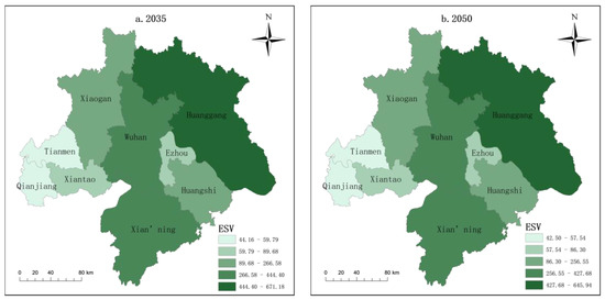 At present, the CA–Markov model is mostly used to predict the spatial development of urban development models [58]. In order to further explore the impact of LUCC on the value of ecological services, we used the LUCC data from 2018 and 2021 extracted from the above analysis, and used the CA–Markov model in the IDRISI software to predict the areas of the different land use types in 2035 and 2050 (as shown in Table 12). The spatial distributions of LUCC and ESV were simulated. The results show that the areas of cultivated land and construction land in the Wuhan Urban Agglomerations will increase (Figure 7), and the ESV of cultivated land will increase, while the areas of forest land, grassland, water area, and unused land will decrease further, and the corresponding ESVs will also decrease. From the perspective of the spatial distribution of ESV (Figure 8), in 2035 and 2050, the ESVs of all cities in study area still show a trend of “low in the west and high in the middle and east”. When comparing the ESVs of different cities, Huanggang City’s ESV is particularly impressive and significantly higher than that of the other regions, specifically exceeding 44.440 billion yuan and 42.768 billion yuan in the two years examined, respectively. Subsequently, the ESVs of Wuhan and Xianning are also quite impressive, and are expected to exceed 26.653 billion yuan and 25.655 billion yuan in 2035 and 2050, respectively. Xiaogan and Huangshi have lower ESVs than the previous two, but are also at a high level in the region, and are expected to exceed 8.968 billion yuan and 8.630 billion yuan in 2035 and 2050, respectively. Finally, Ezhou City, Xiantao City, Tianmen City, and Qianjiang City have relatively low ESVs compared to the rest of the region, but also have growth potential, and are projected to exceed USD 4.416 billion and USD 4.250 billion in 2035 and 2050, respectively.
