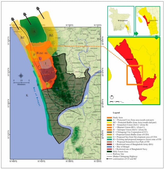 The study, designated as DPZ-07 (see Figure 2), is one of the 12 detailed planning zones (DPZs) contained in the Detailed Area Plan (DAP) 2009 of the CMA [46]. The peri-urban landscape in that region has shown a massive development trend compared to other urban interfaces over time [46,47]. Despite its ecologically uplifted landscape and ability to protect Chattogram’s urban core from various threats, this area has yet to receive adequate planning and management attention. This zone pertains to different land use categories encompassing rural, peri-urban, and urban areas within three unions (Sonaichhari (B), Bhatiari (C), and Salimpur (D)) located in the Sitakunda sub-district of the CMA. These unions are situated between 22°22′ to 22°29′ N and 91°42′ to 91°47′ E. The area is surrounded by diverse geographical features, including the Bay of Bengal to the west, a core zone (A) to the north, and hilly regions to the northeast, east, and south, which form the Chattogram City Corporation boundary. The research region is categorized as DPZ7, which is one of the 12 DPZs within the CMA [46].