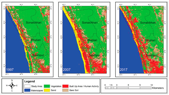 Analyzing the spatial and temporal changes in LULC is one functional method of understanding the current land use scenarios and continuing changes in an area. The land use maps of the separate timelines (1997, 2007, and 2017) extracted from reference maps and satellite images based on visual interpretation illustrate land use classes such as vegetation, built-up, waterscapes, bare soil, and sand.