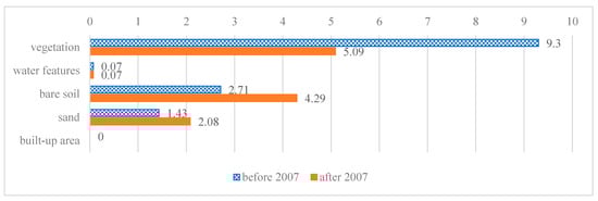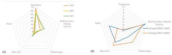 Table 2 presents the study region’s land use and land cover compositions in 1997, 2007, and 2017, as well as their changes in Figure 4a,b. In 1997, 2007, and 2017, vegetation covered over 65, 60, and 50% of the designated region, respectively. Both timelines exhibited vegetation cover shifts of nearly 7%. The built-up areas doubled in size between 1997 (by more than 13%) to nearly 26% in 2017. Bare soil increased more than double from 1997–2007 to 2007–2017, from 1.5 to 4%. The two timelines showed contrasts in terms of waterscapes and sand. The sand category increased by approximately 234 ha, from 3.6 to 6% in the first period; however, it decreased by nearly 3.5% in the last period. Finally, although waterscapes is a minor category, it lost 3% of its surface area between 1997 and 2007 and witnessed a slight increase from 0.3% to roughly 1.5% of DPZ7 over the last ten years.