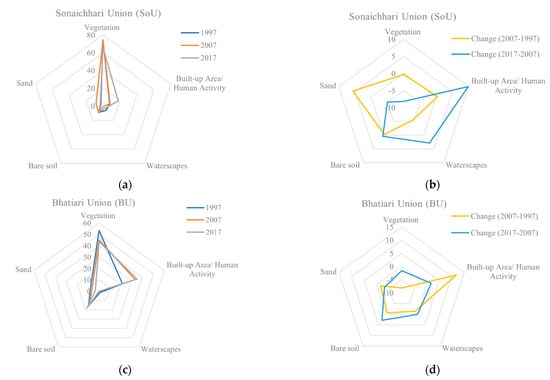 Table 3 presents the percentages of LULC changes in three unions across two study periods. Vegetation cover was the most dominant category. In Sonaichhari Union (SoU), 74% of the land was covered with vegetation in 1997, which remained constant until 2007 and then decreased by 8% over the past decade. Nearly 50% of waterscapes were restored after a massive reduction from 6 to 0.5% in the initial phase (Figure 5a). However, built-up areas rose from 0.5% to over 10% in 1997–2007 and 2007–2017 (Figure 5b). Later, vegetation cover changes in Bhatiari (BU) were reduced by 8% (1.6%). The built-up areas showed growth of nearly 12% in the first ten years and then less significant growth (nearly 2%) in the following ten years (Figure 5c,d). Changes in the land cover areas of waterscapes show a similar trend to those in SoU.