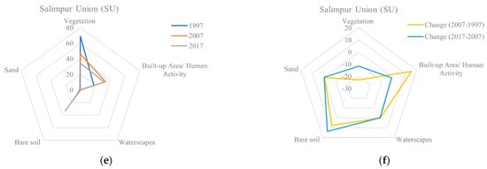 In Salimpur (SU), every category changed drastically and waterscapes disappeared (Figure 5e,f). The vegetation cover declined dramatically from 69% in 1997 to 46% in 2007. From 1997 to 2007, the built-up area increased from 18% to nearly 34%, whereas, from 2007 to 2017, it shrank to approximately 2%. In all time periods, similar trends were observed in the bare soil cover in every union except the moderate increase scenario of SU. Sand cover declined overall, except for the first SoU difference (2.66% in 1997 to 8.30% in 2007).