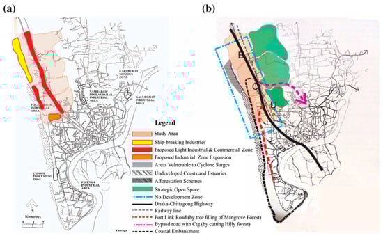 Despite being an environmentally sensitive zone, following a massive cyclone in 1991, as outlined in the Structural Plan (1995–2015) of the CMA, the Government of Bangladesh designated this area as a ‘Future Economic Expansion Area’ [47,49]. This decision has contributed to furthering shipbreaking activities, with Chattogram accounting for 22% of global ship dismantling by 2014 [53]. Additionally, the DAP’s suggestion to utilize small industrial and commercial plots along the highway led to ribbon development, resulting in the depletion of natural resources due to the abandonment of agricultural land, the disappearance of waterscapes, and the clearance of homestead forests. These developments are poised to intensify shipbreaking activities and establish associated business zones within the region, which poses a significant threat to sustainable landscape resource management [1].