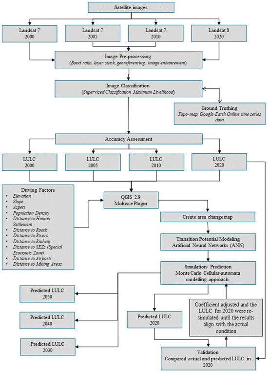 The conceptual model (Figure 2) represents the workflow of LULC classification and future land use prediction. The workflow has three main parts: current LULC classification, LULC prediction, and change.