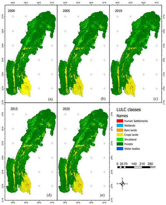 Supervised classification and LULC classes in the Chindwin River Watershed (CRW), Sagaing Region, Myanmar in (a) 2000, (b) 2005, (c) 2010, (d) 2015, and (e) 2020.