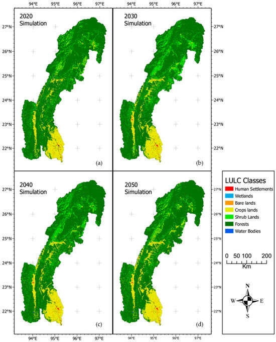 Predicted LULC maps for the years (a) 2020, (b) 2030, (c) 2040, and (d) 2050 in the Chindwin River Watershed (CRW), Sagaing Region, Myanmar.