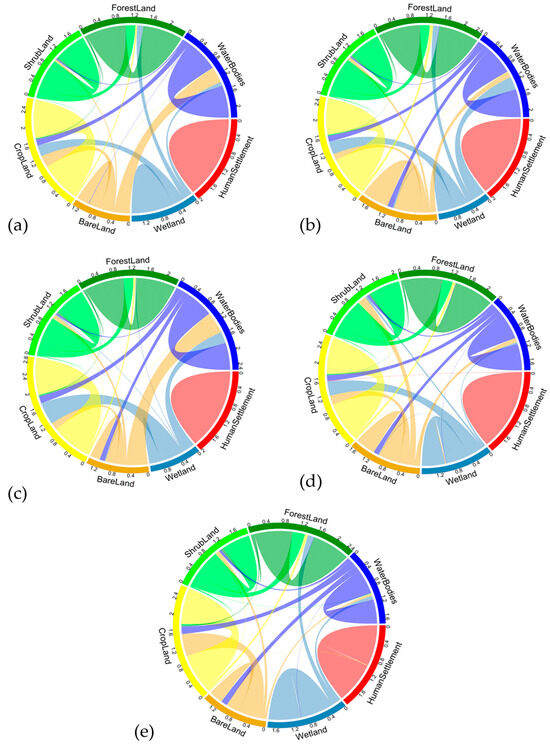 LULC class transition changes (from–to) (a) 2000–2005, (b) 2005–2010, (c) 2010–15, (d) 2015–2020, (e) 2000–2020 in the Chindwin River Watershed (CRW), Sagaing Region, Myanmar.