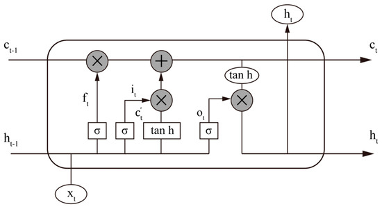 LSTM has three gate structures: a forget gate, an input gate, and an output gate. Its structure is shown in Figure 2, where f, i, c, and o represent the forget gate, input gate, cell state, and output gate, respectively; ct denotes the cell state at moment t, xt denotes the input at moment t, and ht denotes the output at the current moment, representing the input of the next cell state. σ is the Sigmoid activation function, providing an output ranging from 0 to 1, and tanh is a hyperbolic function, resulting in an output ranging from −1 to 1. ft, it, and ot denote the output states of the forget, input, and output gates, respectively. Its equation is (12) to (17), as follows: