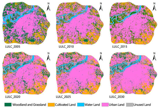 The Landsat images were classified into five LULC categories: (1) woodland and grassland (trees, parks, meadows, playgrounds, and other green vegetation), (2) cultivated land, (3) water land (rivers, lakes, and other small reservoirs), (4) urban land (residential, commercial, industrial, and transportation network areas), and (5) unused land.