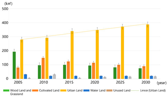 - The area of urban land increased from 2005 to 2030, with a growth rate of 27.81%. The area of woodland and grassland decreased at a rate of 61.07%, and the area of water land and unused land remained stable, indicating that the urban land will continue to expand gradually in the future.
