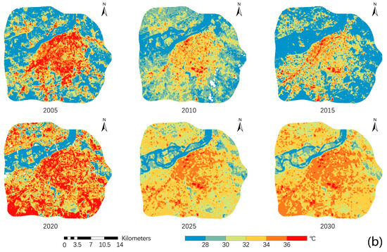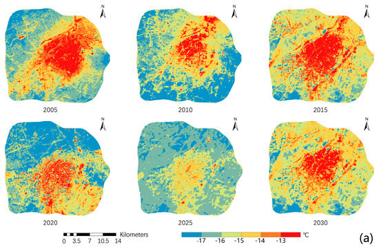 The changes in LULC and LST observed in our study from 2005 to 2030 differ from those observed in other studies. For example, Zhang [40] conducted a study in Wuhan (which is located in the central part of China in a subtropical monsoon climate zone; it is the capital of Hubei Province and is a megacity). They found that the high-temperature zone (LST > 27 °C) in Wuhan’s urban area expanded, whereas the areas of woodland, grassland, and water land in the low-temperature area decreased [41]. These changes exacerbated the rise in LSTs in central urban areas and reduced thermal comfort [42]. This study area, distinct from Wuhan City’s temperature zone, displays an expansion in high-temperature zones and a contraction in extreme-temperature areas. The differences observed between Harbin and Wuhan highlight variations in urban spatial scale, climatic characteristics, spatial layout, LULC, and urban morphology. For instance, Harbin’s urban form, influenced by sunlight exposure and energy-saving requirements, exhibits significant differences in building spacing, volume, and layout compared with Wuhan. These factors contribute to distinct trends and intensities in UHI effects, which also display seasonal and regional variations. This regional study underscores the importance of understanding such localized dynamics.