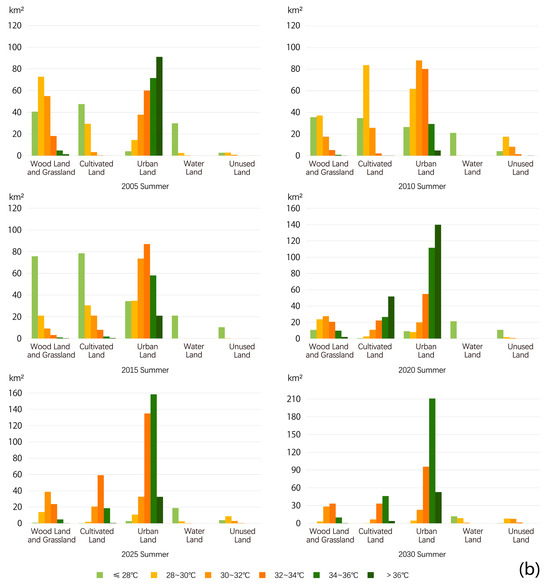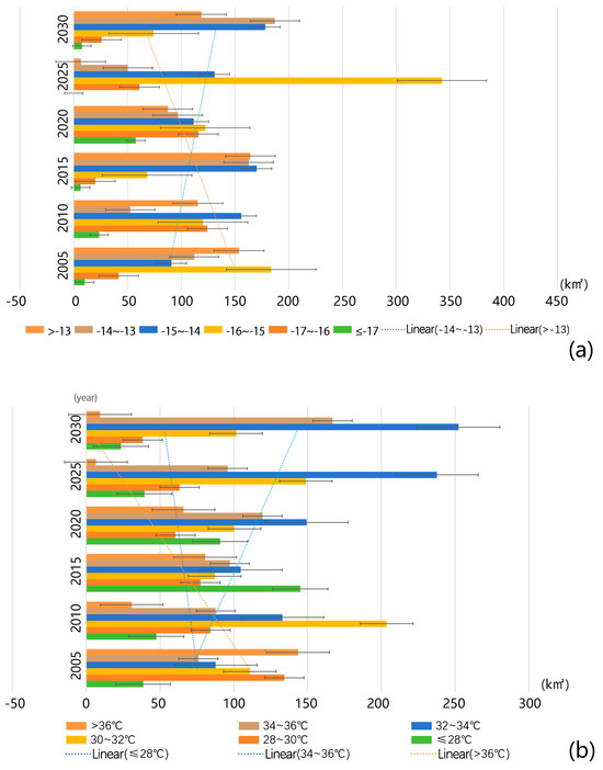 Figure 7 shows the seasonal LSTs for different LULC types during 2005–2030. As shown in Figure 7a, urban land had the highest temperatures in winter. The zones with temperatures in the range of −16 °C to −14 °C increased from 80.98 km2 to 142.06 km2, with a growth rate of 75.43%. The area of the highest temperature zone (LST > −13 °C) exhibited a fluctuating decreasing trend, with a decrease rate of 15.42%. The area of the lowest (LST ≤ −17 °C) and highest (LST > −13 °C) temperature zones for woodland and grassland showed a decreasing trend, with rates of 90% and 76.99%.