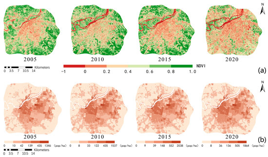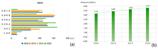 This study conducted spatial and temporal monitoring of LULC types, LST, and UTFVI in the built-up area of Harbin City using Landsat images from 2005 to 2020 and predicted conditions in 2025 and 2030. This study analyzed the relationship between LULC change and LST, UTFVI, and UHI from 2005 to 2030. The results showed that urban land expanded from 2005 to 2030. Areas with higher LSTs increased, and those with extremely high LSTs decreased. An increase in the high-temperature zones increased the average temperature, resulting in a decrease in the temperature difference and anomalous changes in the UTFVI. Areas with high UTFVI values were located in urban areas, and the proportion of zones with medium UTFVI values and above (>0.010) in urban areas decreased each year. The proportion of zones with medium UTFVI values (0.005–0.010) increased, and the proportion of areas with medium UTFVI values and above (>0.005) decreased, indicating that the area affected by the UHI has decreased, the UHI intensity in some regions has increased, and the quality of the urban thermal environment has worsened. A decrease in vegetation cover and an increase in population size affect the UHI. Li [38] found that rapid urban expansion resulted in decreases in the NDVI, increasing the UHI index. Priyadarsini [39] observed that an increase in human activities increased the UHI effect. Figure 13a and Figure 14a show that the area of high NDVI values zones (>0.2) decreased from 2005 to 2030, with a decrease rate of 21.93%, indicating a decrease in vegetation cover. Figure 13b and Figure 14b show that the population increased with a growth rate of 20.86%. This result confirms that the quality of the urban thermal environment has worsened. These findings indicate that the expansion of urban land and the reduction in woodland and grassland have exacerbated the UHI and the unsustainability of urban development. Therefore, it is necessary to reduce the expansion of urban land and increase the area of woodland and grassland or improve the vegetation cover to mitigate the UHI effect.