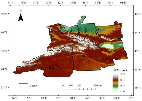The NSTM is located in the Xinjiang Uygur Autonomous Region of China (75°31′ to 91°54′ E, 39°34′ to 46°12′ N) in the transition area between the northern foot of the Tianshan Mountains and the Junggar Basin. A map of the administrative divisions of the Xinjiang Uygur Autonomous Region of China is displayed in Figure 1. Backed by the Tianshan Mountains, this region features a temperate continental semi-arid climate with low annual precipitation and significant seasonal variations. The terrain of the NSTM is generally higher in the south and lower in the north. The Tianshan Mountains span the entire Xinjiang region, crossing the following nine subordinate regions: Kashgar, Aksu, Ili Kazakh Autonomous Prefecture, Bortala Mongol Autonomous Prefecture, Bayingolin, Changji, Urumqi, Turpan, and Hami. The Tianshan Mountains form the natural geographical boundary between the Junggar Basin and the Tarim Basin and are a distinctive feature of Xinjiang’s geography. The NSTM is the most economically developed region in Xinjiang, focusing on agriculture, animal husbandry, and the development of energy resources such as petroleum and coal, holding significant influence across Xinjiang. The urbanization level in the northern slope region reaches 86.98%, making it a highly productive area. This region boasts the most advanced modern industries, agriculture, transportation, information technology, education, and science and technology in Xinjiang. It houses 83% of Xinjiang’s heavy industry and 62% of its light industry, contributing over 40% of the region’s GDP annually. With excellent infrastructure in terms of urban areas, transportation, and energy, it plays a crucial role in driving, influencing, and setting examples for the economic development of Xinjiang.