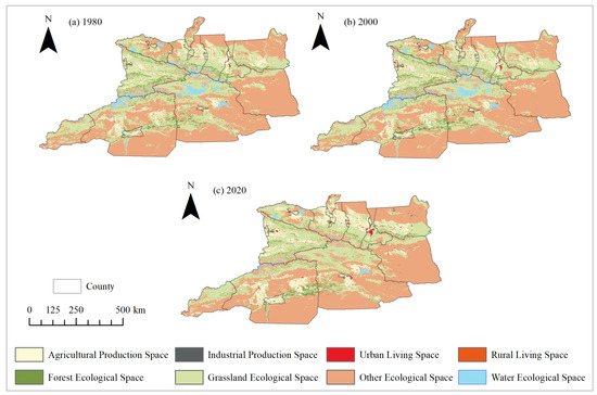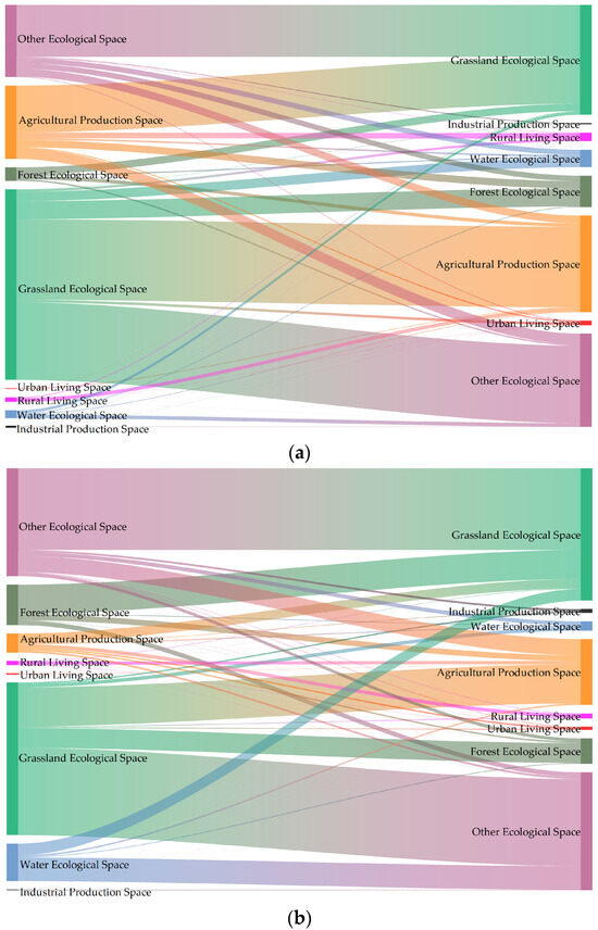 From the changes at the secondary level, during the period from 1980 to 2020, Agricultural Production Space, Industrial Production Space, and Urban Living Space continued to grow rapidly, increasing by 21,596 km2, 1487 km2, and 1424 km2, respectively. Among them, the changes in Industrial Production Space and Urban Living Space were the most drastic. Rural Living Space showed steady growth, with an increase in area of 721 km2. The area of Forest Ecological Space initially decreased, then increased over time. The area of Water Ecological Space also decreased. It decreased significantly by a total of 10,925 km2. This amount is less than 50% of the initial study period. The Grassland Ecological Space continued to decrease, although the change was relatively small, with rates of −3.47% and −4.22% over the two periods; however, due to the large base area of Grassland Ecological Space, the total decrease was 15,639 km2. The area of Other Ecological Space showed slow growth.
