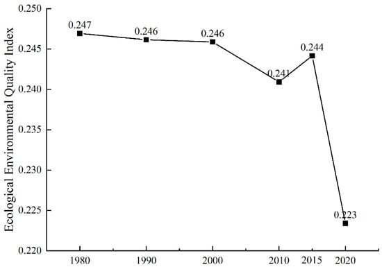 The EEQ Index is quantitatively characterized by comprehensively considering the EEQ of various land use types in the region and their area proportions. This index can be used to describe the EEQ of a certain area. A 2 km × 2 km grid cell was established, generating a total of 143,590 grid cells. The 2 km × 2 km grid cell contains 4 grids from the land use data, which ensures a rich variety of land use types in the region and avoids the problem of large grids and discrepancies between research results and actual situations. Therefore, connecting the land use data for the years 1980, 2000, and 2020 with the grid data allows for the quantitative characterization of the EEQ on the NSTM, reflecting its spatial distribution and spatiotemporal changes [20]. The formula is as follows: