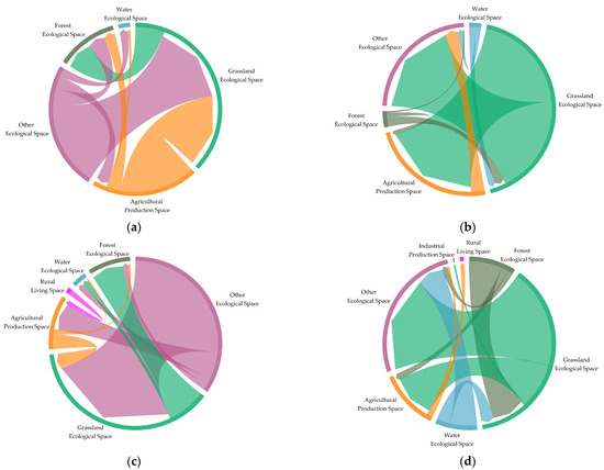 A land-use transfer matrix was constructed for the P-L-E Space on the NSTM (Figure 3). The results indicate that, from 1980 to 2000, A large amount of Grassland Ecological Space was converted into Agricultural Production Space or degraded into Other Ecological Space. The increase in Urban Living Space was mainly at the expense of Grassland Ecological Space. The Industrial Production Space mainly transformed from Other Ecological Space.