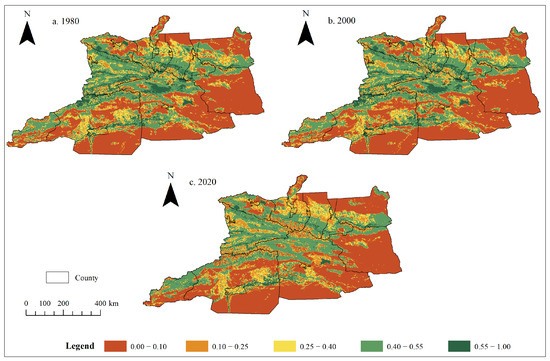 Based on the area of the NSTM, a grid of 2 km × 2 km was established in ArcGIS software, creating a total of 143,590 grids. Using these grids as the smallest research units, we examined the EEQ of the NSTM, resulting in the spatial distribution characteristics for the years 1980, 2000, and 2020 (Figure 6). According to the natural breakpoint method, the EEQ was classified into five levels, and the number and area of grids at different levels were counted (Table 3). The results show that the EEQ on the NSTM mainly presents a “high in the northwest, low in the southeast” pattern. During the three periods (1980, 2000, 2020), the areas with low EEQ on the NSTM accounted for 42.49%, 42.84%, and 44.39%, respectively. Nearly half of the areas on the NSTM had poor EEQ, mainly distributed in Turpan, Aksu, and Bayingolin. During the research period, the highest level of EEQ change was observed in the high-quality area. Its proportion decreased from 7.62% to 3.77%, with many of these grids falling to low-quality and relatively low-quality areas.