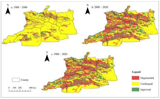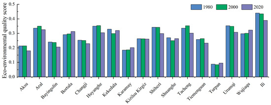 Figure 7 shows the EEQ variation on the NSTM. From 1980 to 2000, the EEQ on the NSTM remains unchanged, with a regional proportion of 82.51%. The proportion of EEQ rising and falling areas is 7.95% and 9.54%, respectively. The regions with improved EEQ included Turpan, Urumqi, the Ili Kazakh Autonomous Prefecture, Kekedala, and Shuanghe. The regions with declining EEQ included Aral, the Bortala Mongol Autonomous Prefecture, and the Tacheng Region (Figure 8). From 2000 to 2020, the EEQ on the NSTM has undergone drastic changes, with a proportion of 57.11% in the affected areas. Among them, the proportion of areas with a decreased EEQ is 33.54%, while the proportion of areas with a increased EEQ is 23.57%. The EEQ in the Tianshan Mountains has significantly decreased. Except for the Bortala Mongol Autonomous Prefecture, Kekedala, Shuanghe, and Wujiaqu, the EEQ in other regions declined. The regions with significant declines included Aksu, Bayingolin, Huyanghe, Shihezi, Tacheng, and the Ili Kazakh Autonomous Prefecture. Spatially, the decline in EEQ was more severe in the northern part of the NSTM than in the southern part, and the areas near the Tianshan Mountains showed more pronounced declines (Figure 8). Overall, from 2000 to 2020, the changes in EEQ on the NSTM are similar to those from 2000 to 2020, with the proportion of areas experiencing a decrease in EEQ further increasing, reaching 34.36%.