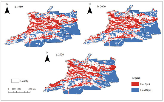 Figure 9 shows the spatial distribution of EEQ cold and hot spots during the study period (1980–2020). The EEQ hot spots are mainly concentrated in the central and western parts of the NSTM. The EEQ cold spots are mainly concentrated in the eastern and southern parts of the northern slope of the Tianshan Mountains. In 1980, the EEQ cold spots were mainly concentrated in Turpan, the southern part of Aksu, and the southern part of Bayingolin. The EEQ hot spot patches were distributed along the Tianshan Mountains. In 2000, the distribution of EEQ cold spots and hot spots did not change significantly and was similar to the pattern in 1980. There was a slight increase in hot spots in the northern part of the NSTM and a slight increase in cold spots in the southern part. In 2020, the distribution of EEQ cold and hot spots on the NSTM underwent significant changes. The Tianshan Mountains were divided into the northern, central, and southern ranges. In the northern Tianshan Mountains, the EEQ hot spots formed two concentrated areas, and the area of the EEQ hot spots increased. In the northern Tianshan Mountains, the EEQ hot spots significantly decreased near Urumqi and significantly increased in the Changji. The area of EEQ hot spots in the central Tianshan Mountains significantly decreased, especially in parts of the Aksu and Bayingolin areas. The area of EEQ cold spots increased in the northern and southern parts of the NSTM, while the area of EEQ cold spots slightly decreased in the eastern part of the NSTM.